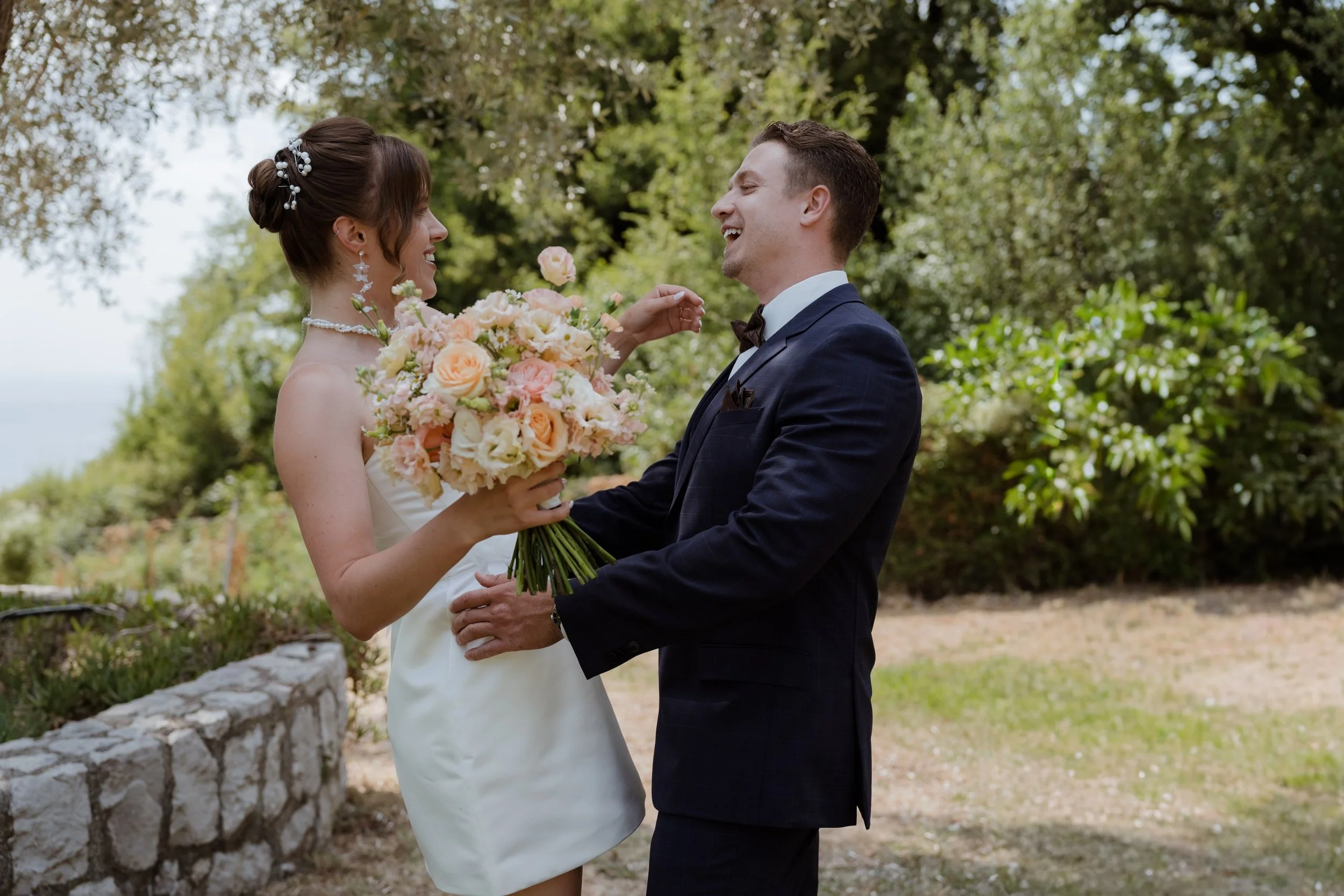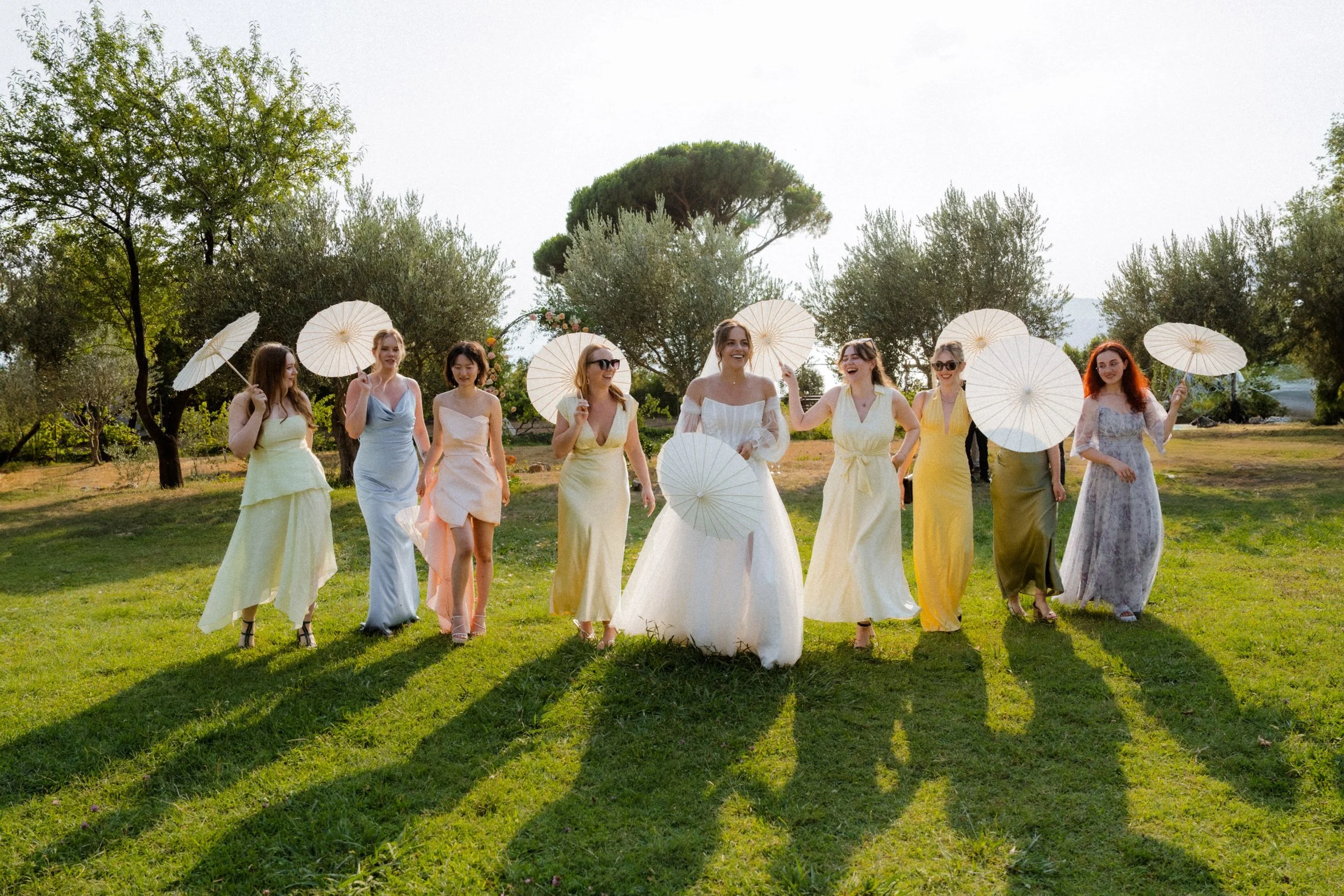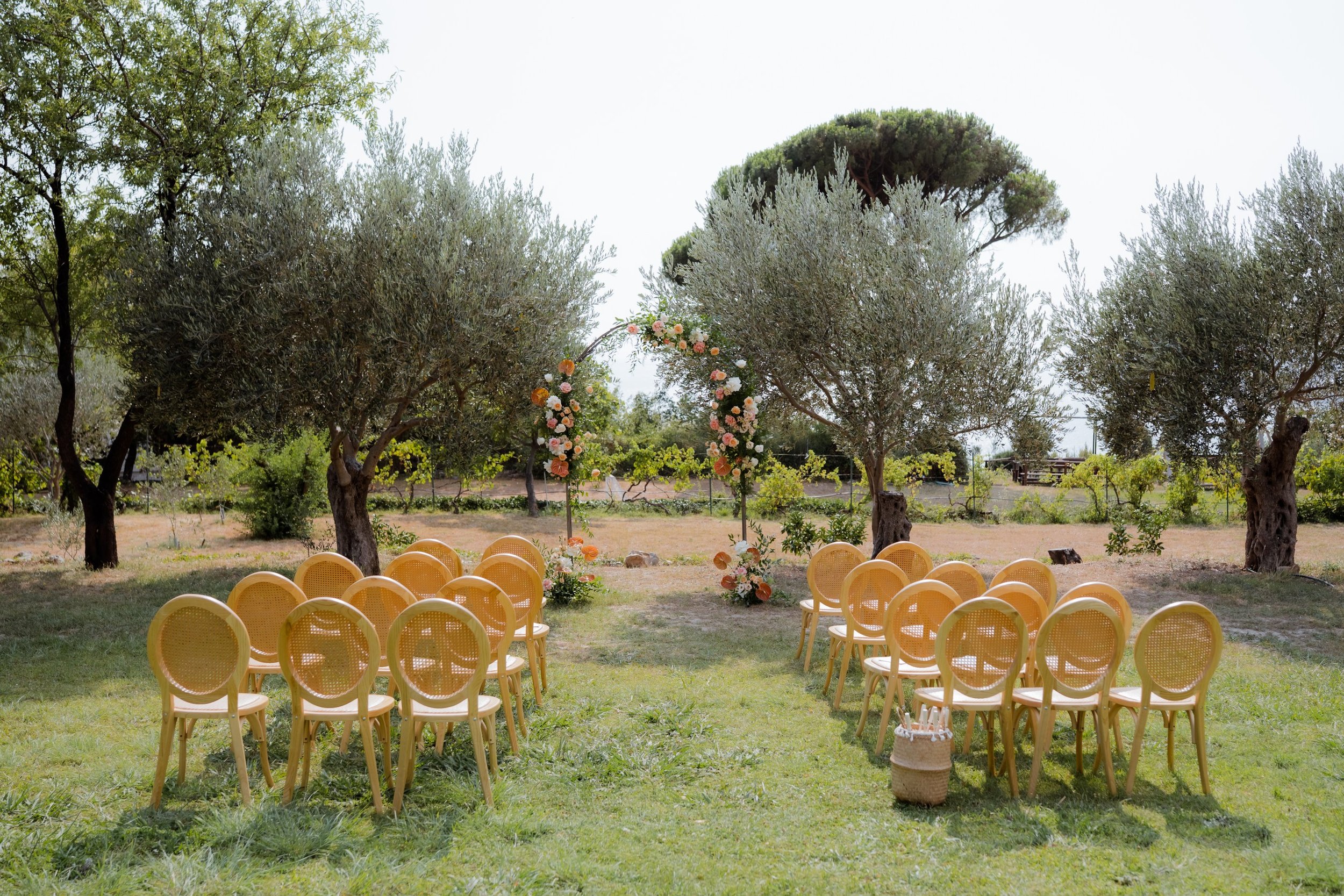 A boho-style wedding in nature, amidst green meadows, with cozy wooden decorations and simple yet beautiful details.